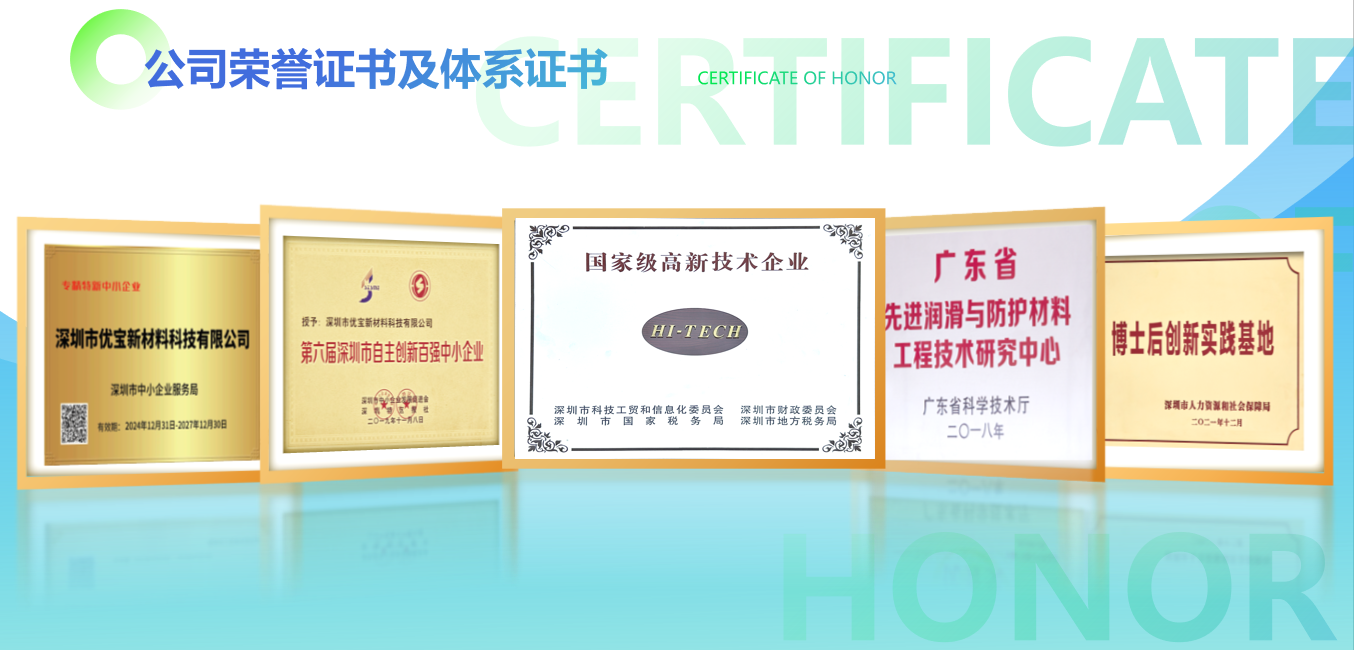 持续创新使优宝新材拥有多项自主知识产权,荣获国家级高新技术企业,中国中小企业创新100强、深圳自主创新百强企业,技术成果广泛应用于多行业。